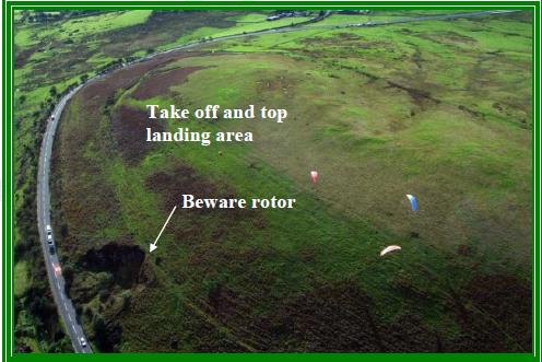 - Bottom Landing: Bottom landings are challenging, especially for hang gliders, due to the slope and cables. Paragliders can land more easily on either side of the road near the layby. Hang gliders should consider uphill downwind landings in light winds.